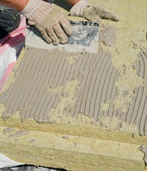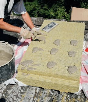 Kom lim på pladerne. Bland Multipuds op, og kom klatter bag på isoleringspladen. Her lægges mange klatter på pga. skorstenens udsatte placering.