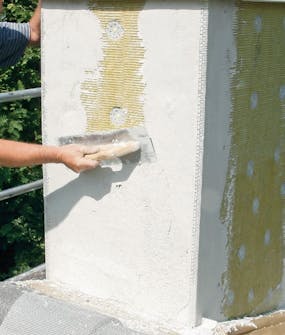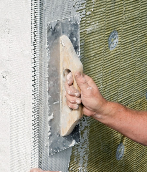 Isoleringspladerne er ganske vist halvhårde, men for at pudsen kan sidde ordentligt fast, skal den armeres. Det gør du ved at støbe et særligt armeringsnet ind i pudslaget. Først et tyndt lag puds, så net på hjørner og sider, så endnu et lag puds. Og til sidst et afsluttende pudslag.