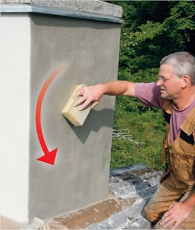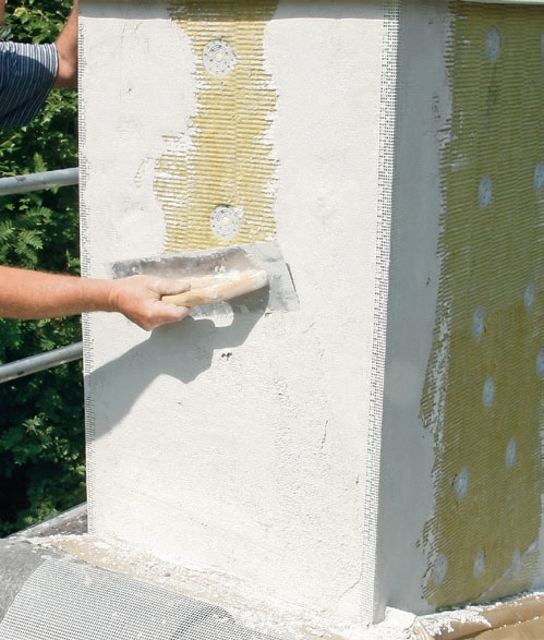 Nu skal du pudse hele skorstenen. Med et stålbræt trækker du Skaltherm Grundpuds på alle fladerne i 5 mm’s tykkelse.