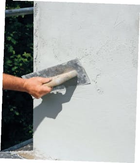 Når grundpudsen er tør, trækker du slutpuds på. Her er det Skalcem S2000/ CF2000. Kom Beto-binder i blandevandet for at gøre pudsen stærkere.