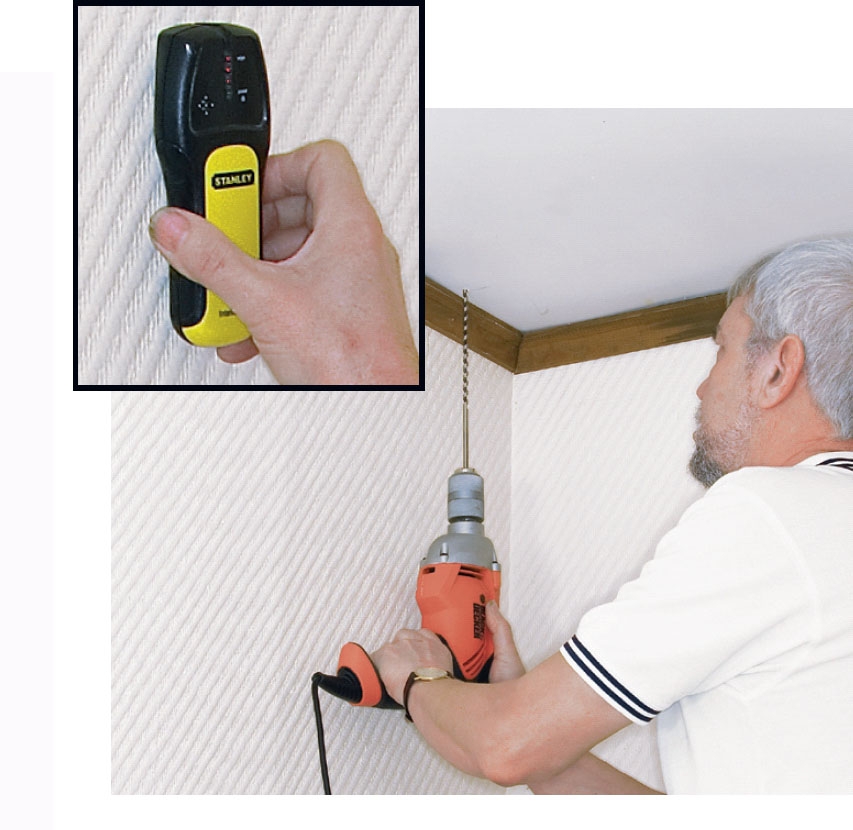 Væg og loft tjekkes for rør og ledninger med en vægskanner.