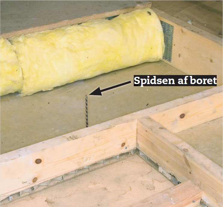 Før vi skærer i væggen, tjekker vi skorstenens videre vej op gennem etageadskillelsen ved at bore et langt tyndt bor gennem loftet. Det sker også ude i bryggerset - der, hvor vi planlægger at have midten af skorstenen.