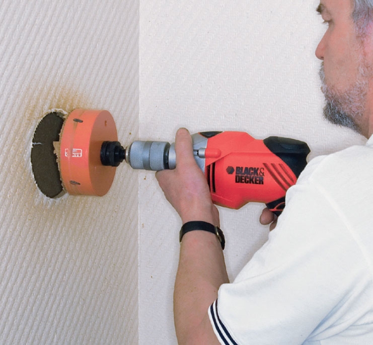 For en sikkerheds skyld borer vi et hul i vægpladen med en stor hulsav. Selv efter at have skannet væggen for ledninger og rør kan man nemt støde på overraskelser, men med et lille spejl og en lygte kan vi se ind bag pladerne.