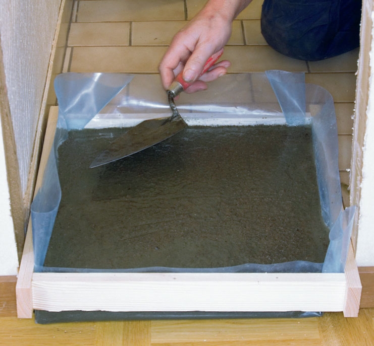Det lille pladefundament, som skal udligne niveauforskellen mellem gulvet i stuen og i bryggerset, støber vi i en ramme, som er foret med plastfolie. Betonen armeres med et stålnet og rystes sammen med lette slag på rammen.