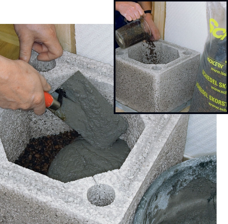 Siderne i hullet pudses op med samme lim, som vi brugte til at samle elementerne med. Vi fylder først lecanødder i bunden af lysningen, så vi med limen kan bygge en bund i højde med lemmen, som soden kan fejes ud fra.