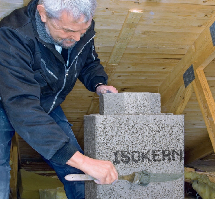 Du kan købe elementer med hul til en renselem både i kernen og i yderskallen, men her har vi bygget med de normale elementer og borer selv hul til den lem, som skorstensfejeren bruger, når han fjerner sod fra skorstenen.