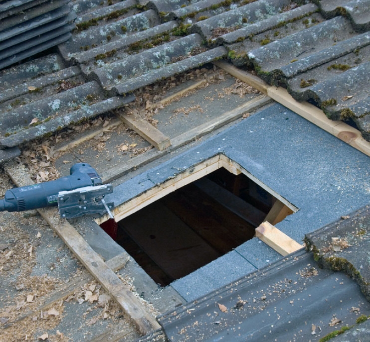 Hullet skærer vi ud med stiksav fra tagets overside efter at have fjernet de nødvendige tagsten. Placeringen har vi ført op på oversiden ved at bore lodret gennem de fire hjørner i den markering på undersiden, som vi lavede lige før.