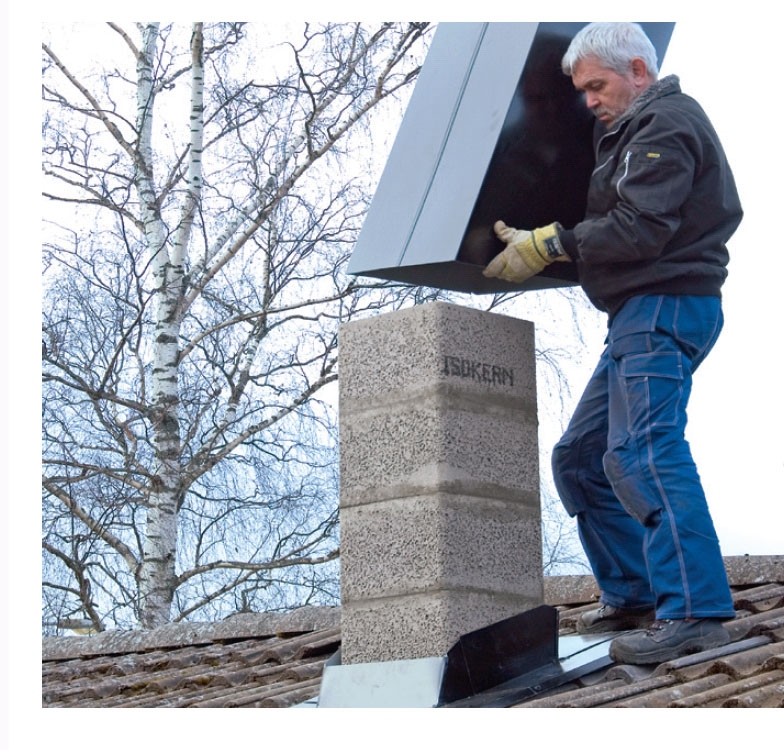 Over taget bygger vi piben af de samme elementer som inde i huset. Piben vil vi dække med en zinkkappe, som vi har købt færdig sammen med alle de øvrige materialer. Det er en meget nem løsning, som man er sikker på, at inddækningen omkring hullet i taget passer perfekt til.