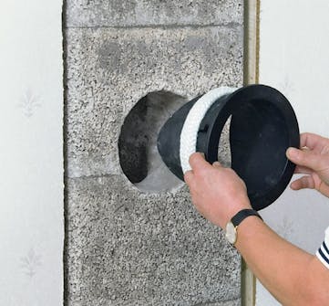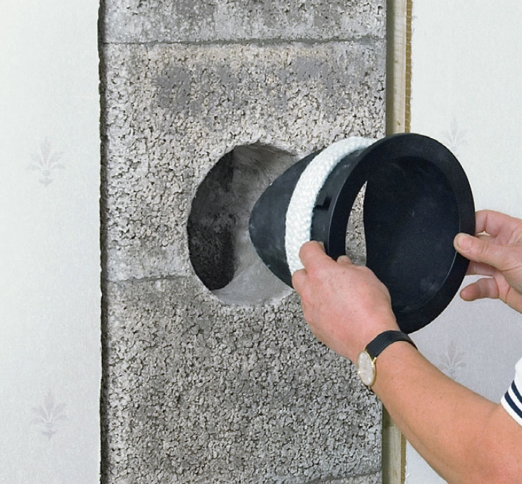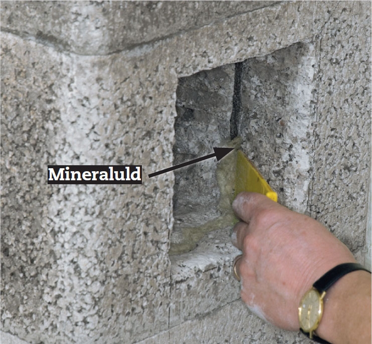 Revnen mellem kerne og yderskal tætnes med mineraluld, når hullet er rettet til og glattet, så renselemmen kan glide ind på plads.