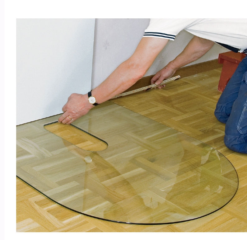 Gulvpladen af glas lægges på plads. Vi måler omhyggeligt op, så den ligger helt lige, før ovnen stilles på den. For at undgå at få støv og sand ind under pladen kan du lukke kanterne med en tynd stribe klar silikone.