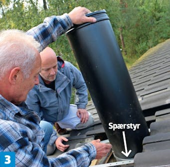 Placér skorstenen i spærstyret. Det er lettest, hvis I er to, og den ene kan holde det lidt adskilt. Så er det nemmere at få skorstenen på plads. Tjek, at skorstenen sidder så lige som muligt.
