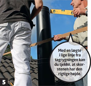 Tjek, at skorstenen står lige. Vi tjekker også, at skorstenen har den rigtige højde. Toppen skal her være min. 40 cm over tagrygningen. Det kan du tjekke med en lægte. Spænd skorstenen fast.