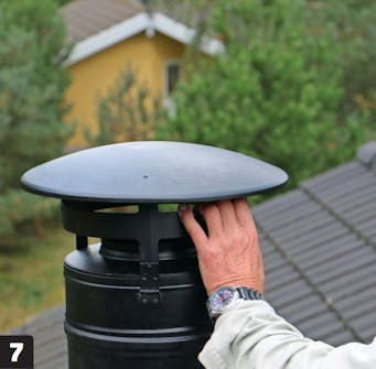 Sæt skorstenshætten på. Det skal du først gøre til allersidst, ellers kan du ikke få den bløde inddækning på plads. Hætten fast -gøres med et enkelt spændebånd.