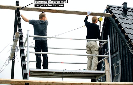 Det inderste spær hejses op ved hjælp af en talje, der er gjort fast i kippen på huset. Før du trækker, anbringes spærfødderne inde ved gavlen, så taljen “vipper” spæret op. Spæret skubbes ind til gavlen og fikseres med tvinger og skruer.