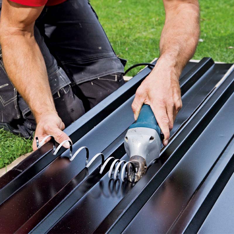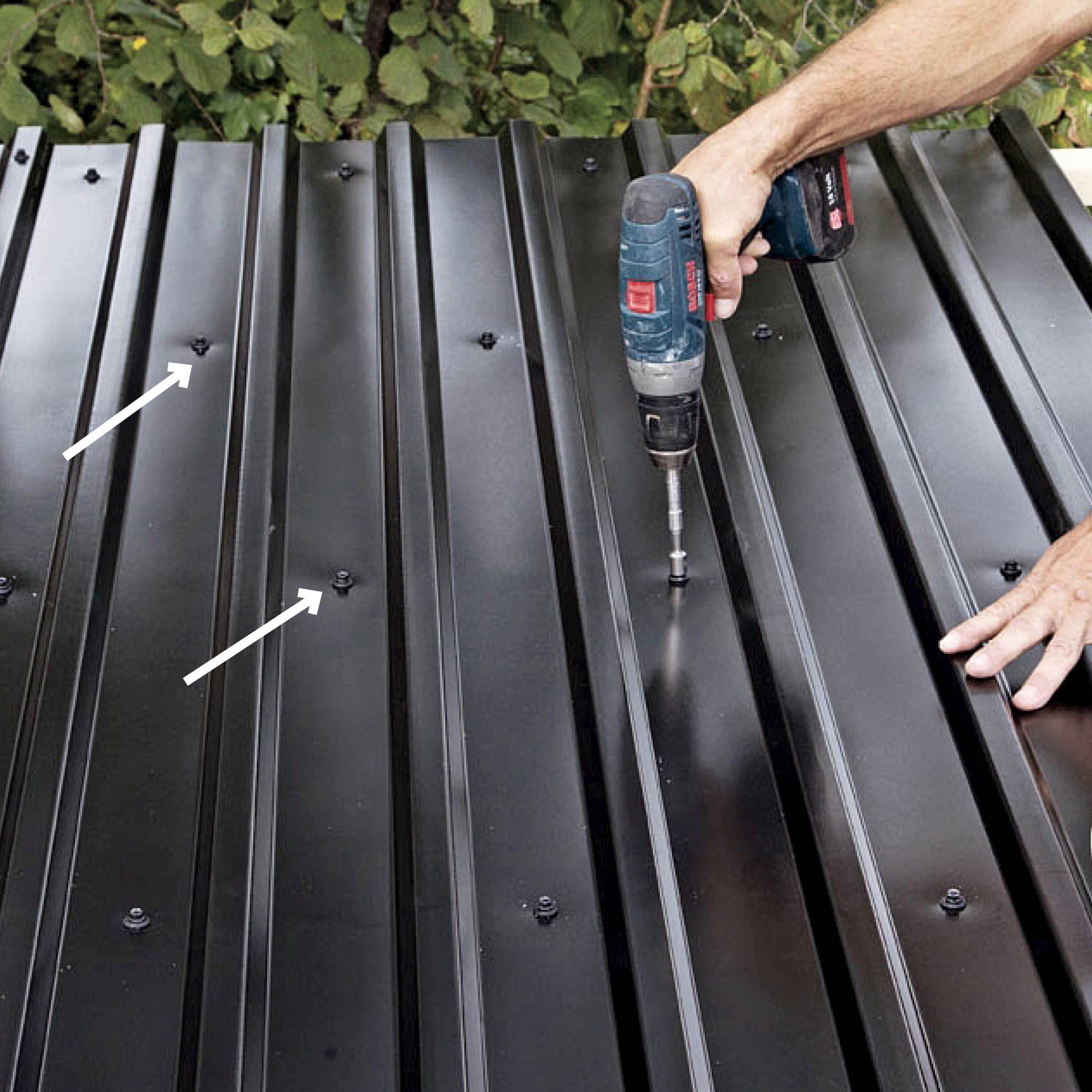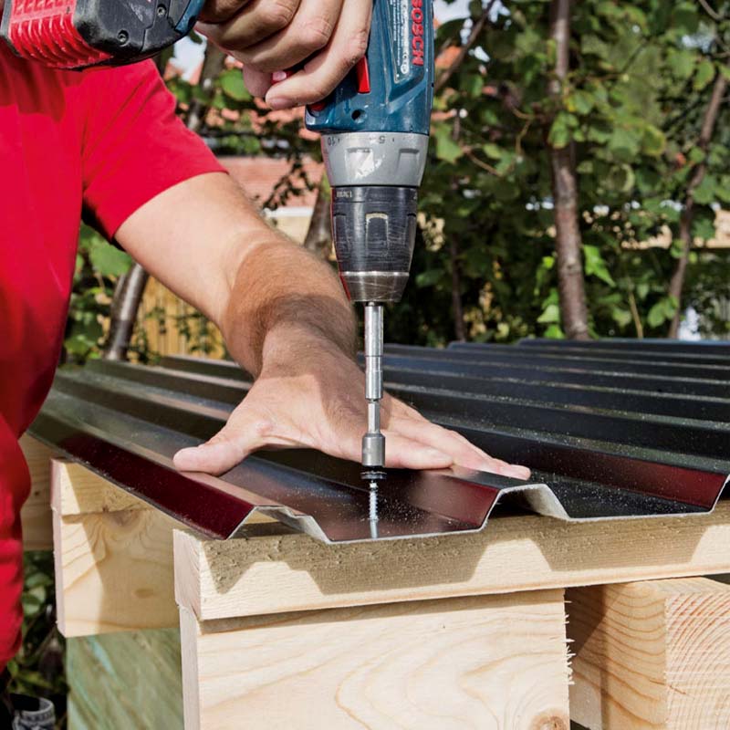 I siderne samles pladerne med korte overlapsskruer, 4,8 x 20 mm, i en “bølgetop”. De skal ikke ned og have fat i lægterne, men blot holde pladerne sammen.