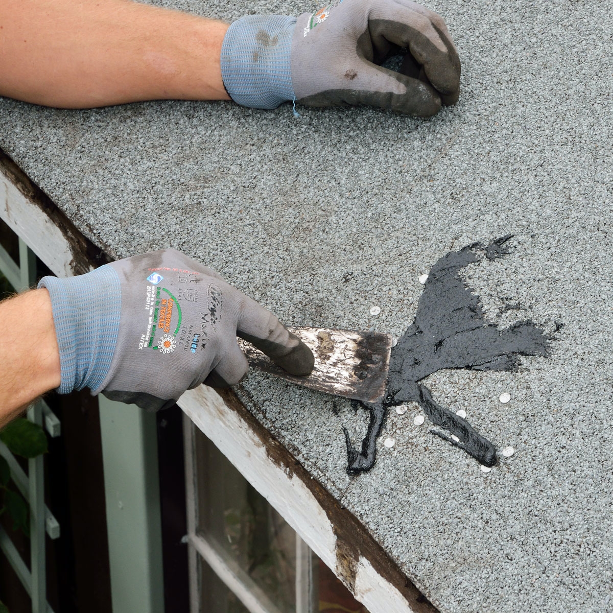 Pres fligene hårdt ned i asfaltmassen, og giv dem søm, indtil de sidder fast. Det er vigtigt, at tagpapfligene slutter helt tæt.