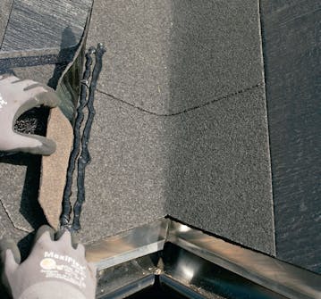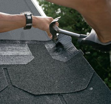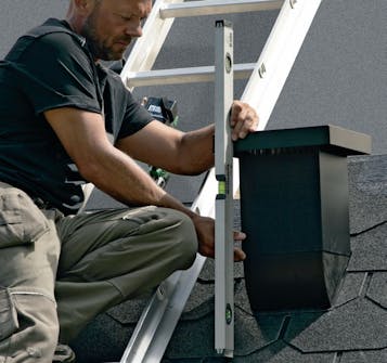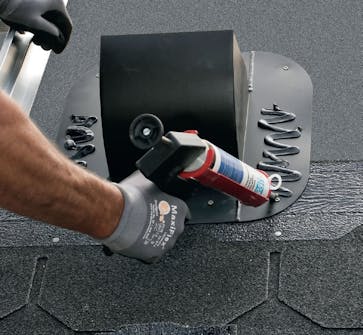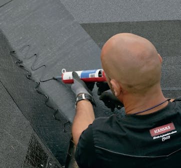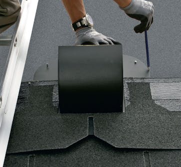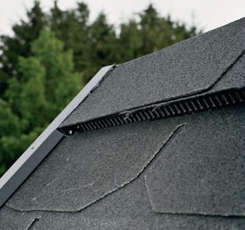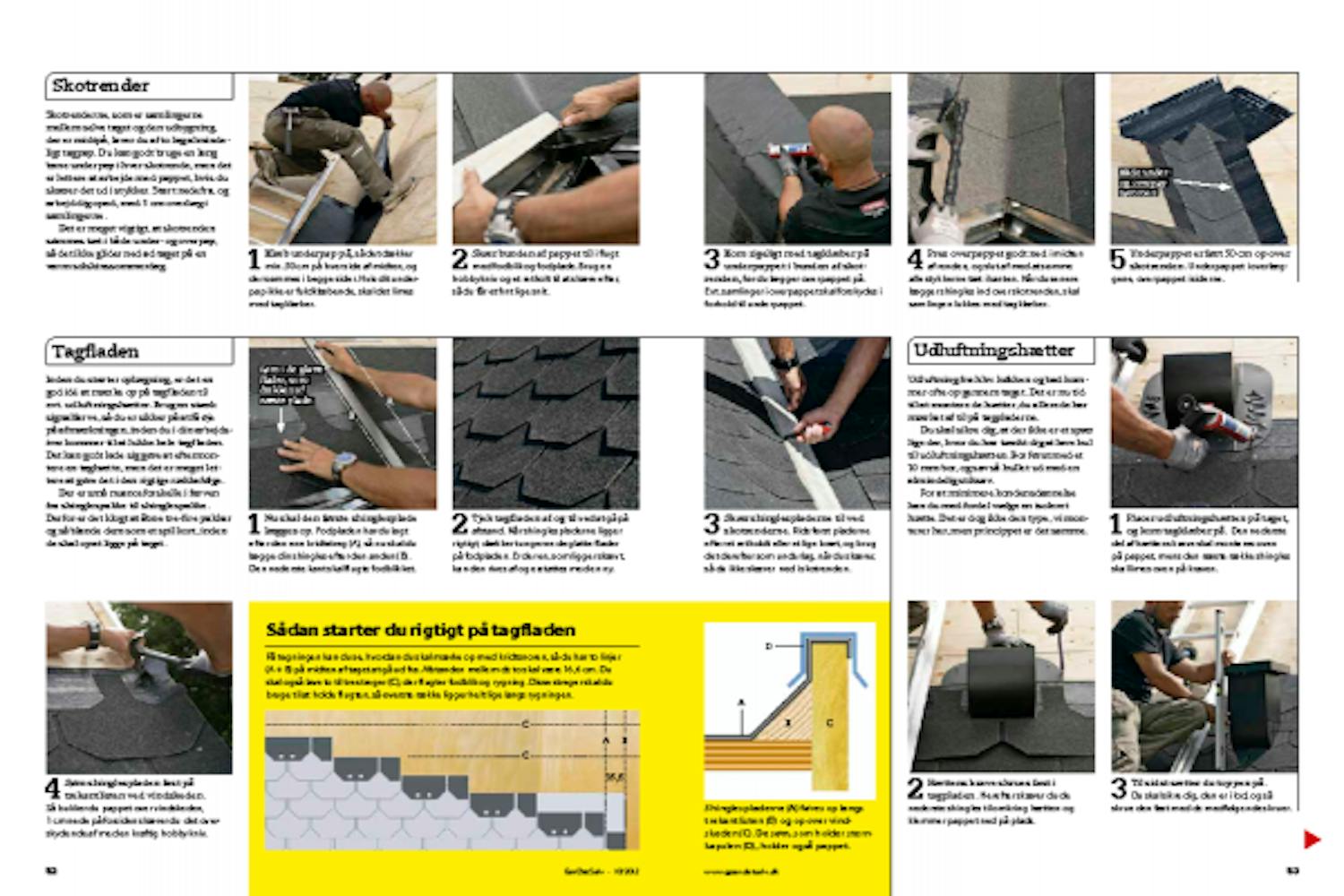 Placer udluftningshætten på taget, og kom tagklæber på. Den nederste del af hættens krave skal monteres oven på pappet, mens den næste række shingles skal limes oven på kraven.