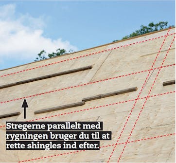 Før du begynder at lægge shingles på taget, er det en rigtig god idé at trække et antal streger fra vindskede til vindskede parallelt med rygning og tagfod. Så har du hele tiden nogle målepunkter at forholde dig til, når du arbejder dig op mod rygningen med dine shinglesplader. Tjek hellere en gang for meget end en gang for lidt, så rækken af shingles flugter, når du når op i toppen.