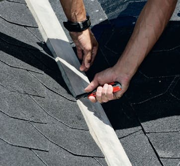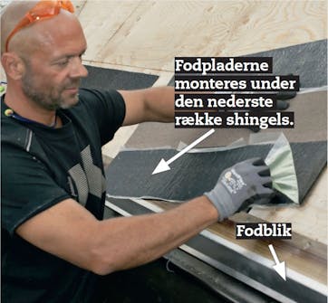 Hættens krave skrues fast i tagpladen. Herefter skærer du de nederste shingles til omkring hætten og klemmer pappet ned på plads.