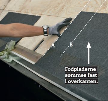 Læg fodpladen på, så den flugter med forkanten af fodblikket og med den ene af dine kridtsnorsstreger. Når fodpladen flugter stregen (A), skal den første shingles flugte den anden streg (B).