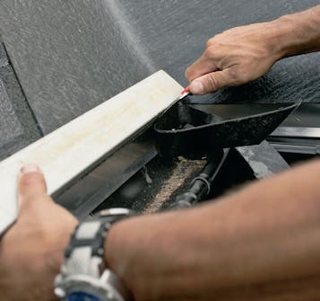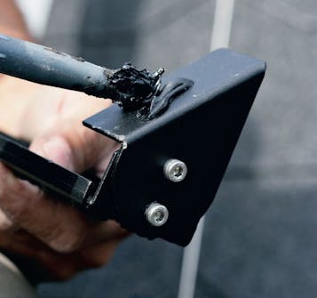 Smør tagklæber på bagsiden af trinene, inden du skruer dem fast. Nok til at lukke hullet om skruen, men ikke så meget, at det klemmes ud under trinet.