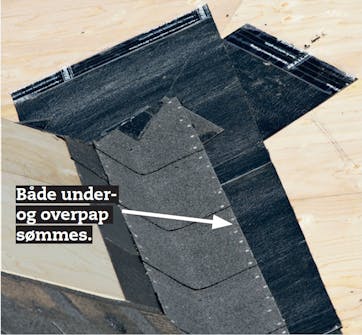 Pres overpappet godt ned i midten af renden, og slut af med at sømme alle stykkerne tæt i kanten. Når du senere lægger shingles ind over skotrenden, skal samlingen lukkes med tagklæber.
