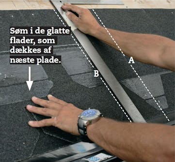 Nu skal den første shinglesplade lægges op. Fodpladen har du lagt efter den ene kridtstreg (A), så nu skal du lægge din shingles efter den anden (B). Den nederste kant skal flugte fodblikket.