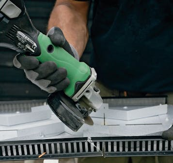 Skær den første rygningsplade til med en vinkelsliber, så den passer i smig over trekantlisten og op mod vindskeden. Skru rygningspladen fast.