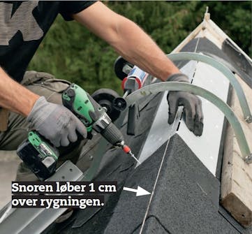 Skru de øvrige plader fast. Bemærk snoren, som er trukket 1 cm over rygningen i hele husets længde. Pladerne rettes ind efter snoren, og afstanden mellem snor og rygning kontrolleres løbende.