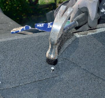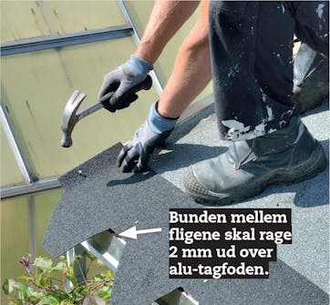 Søm første række shingles fast med to søm i hver side. Inden du lægger rækken på, skal du huske at fjerne bagsidefolien, så rækken kan klæbe fast til underlaget.