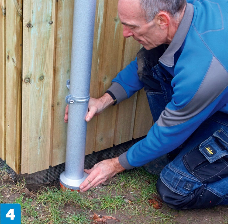 Nedløbet føres via to vinkelstykker og et mellemrør fra tagrenden og ind til facaden. Ved jordhøjde skal det tilpasses kloakken. I vores tilfælde er nedløbet placeret så tæt på facaden, at det kan føres direkte ned i kloakken. Hvis kloakken ligger længere ude fra facaden, skal du montere en såkaldt nedførsel, der leder vandet et stykke ud fra facaden og ned i den eksisterende kloak.