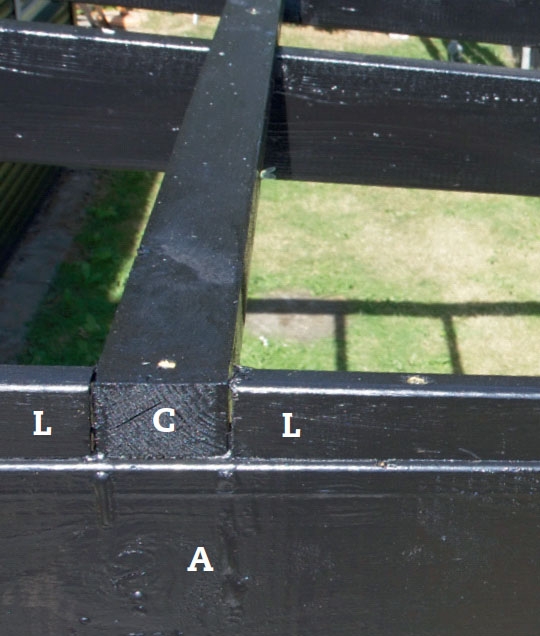 Det betyder nemlig, at der siderne kun er lægternes ender under presenningen, og derfor fylder vi op mellem dem med støttelisterne (L), der sættes på oversiden af spærene mellem lægterne.