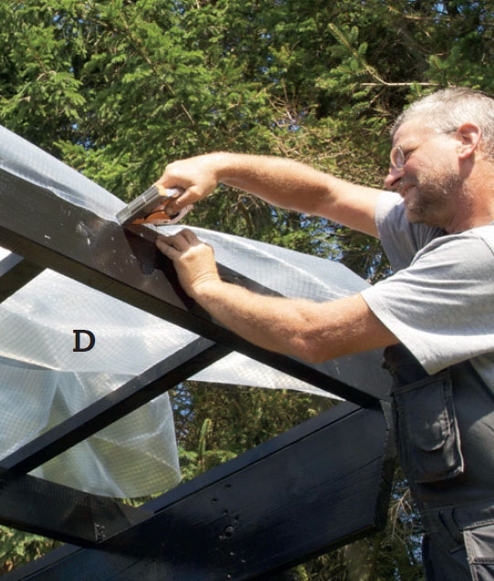Ved tagets underkant skruer du en lægte (C) uden på den nederste lægte, så den klemmer presenningen fast - klammer alene vil hurtigt blive revet igennem dugen. Du kan også skrue et bræt på i stedet.