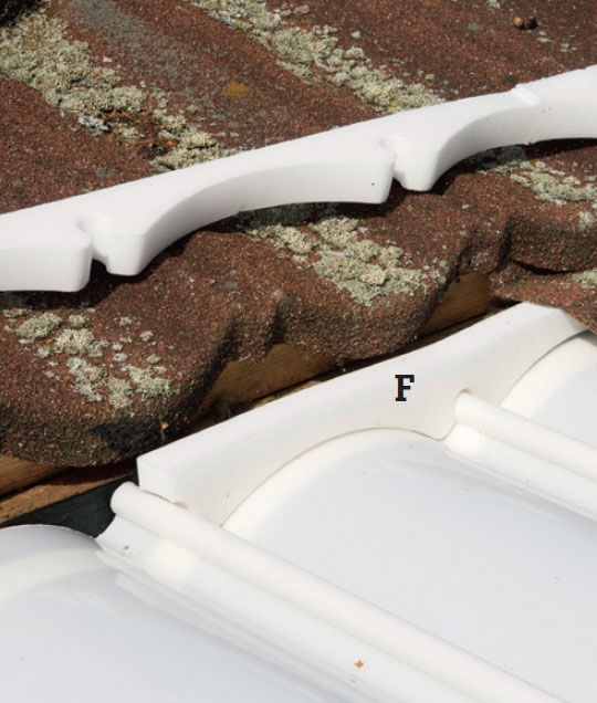 Skumtætningslisterne (F) lægges på plads oppe og nede. Når pladen trykkes på plads, fanger den derefter det faste skumbånd, så det lukker tæt af mellem presenningen og tagpladerne.