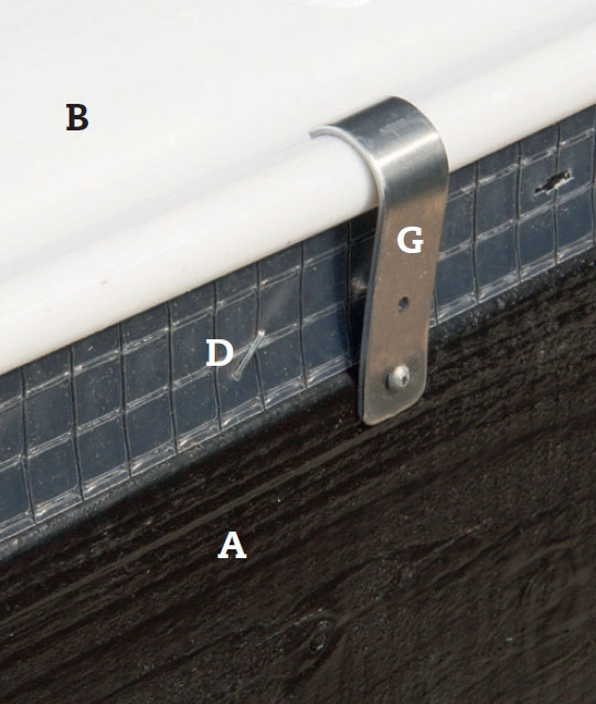 - En ekstra lægte (C) til at klemme presenningen fast forneden Klar, armeret presenning/undertag (D)