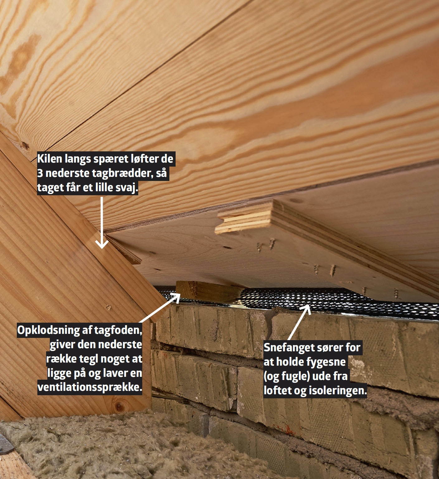 Så skal der afstandslister på. De skal være min. 25 mm tykke og trykimprægnerede, da de kan komme i kontakt med vand, som løber ned ad undertaget.