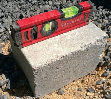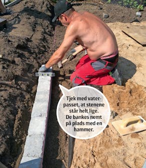 Fjern skærverne på et lille område, og sæt den nederste sten, der skal være bænkens ben. Kantblokkene sættes i afretningsgruset. Tjek, at stenen ligger helt lige.
