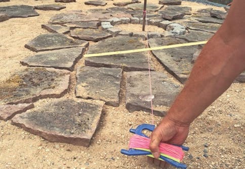 Bestem, hvor midten af den runde terrasse skal være. I midten sættes en lille cirkel af brosten. Cirklen tegner du op ved at sætte en jernstang i midten af terrassen, som du binder en snor i med en pind i den anden ende, så du kan tegne den lille cirkel op. Læg derefter naturstenene rundt om cirklen af brosten. De lægges her med en afstand på ca. 3-4 cm, så der er plads til granitskærver imellem.