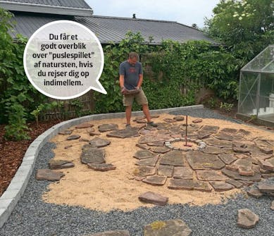 Det er et puslespil at lægge de uens natursten, så det er en god idé at rejse sig op undervejs, så du kan se belægningen lidt på afstand og danne dig et overblik over, hvilke sten der passer bedst hvor.