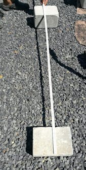 Der sættes kantblokke i siderne, så de granitskærver, der skal lægges ud omkring naturstenene, bliver på deres plads. Kantblokkene sættes i beton og rettes ind efter en snor, så de står lige.