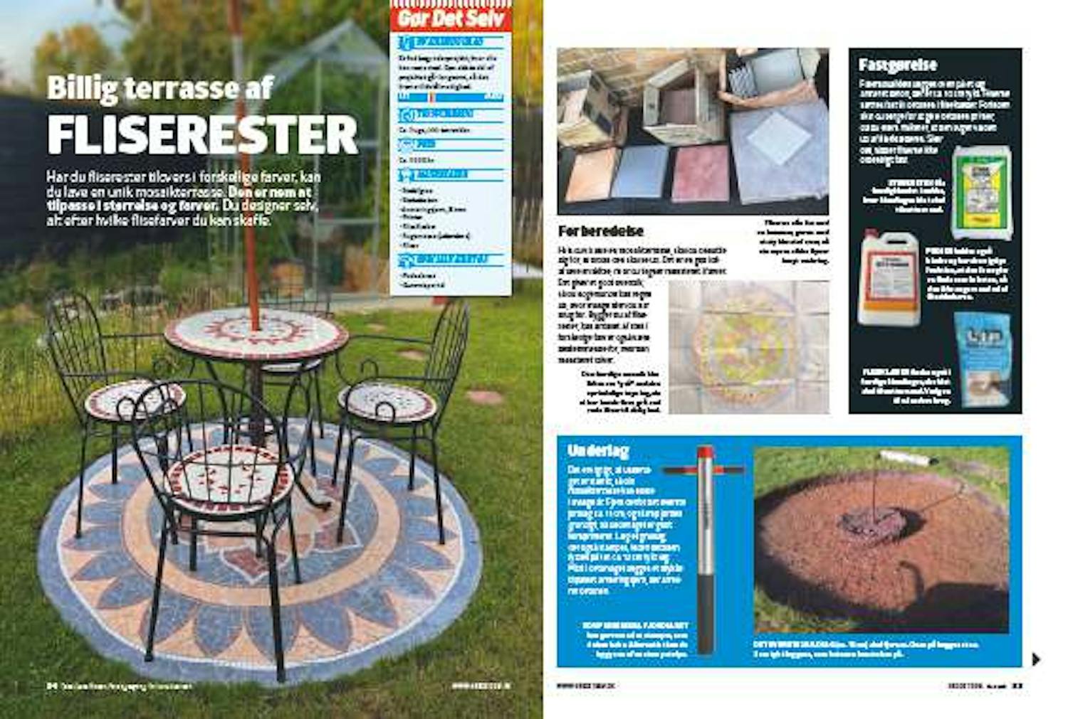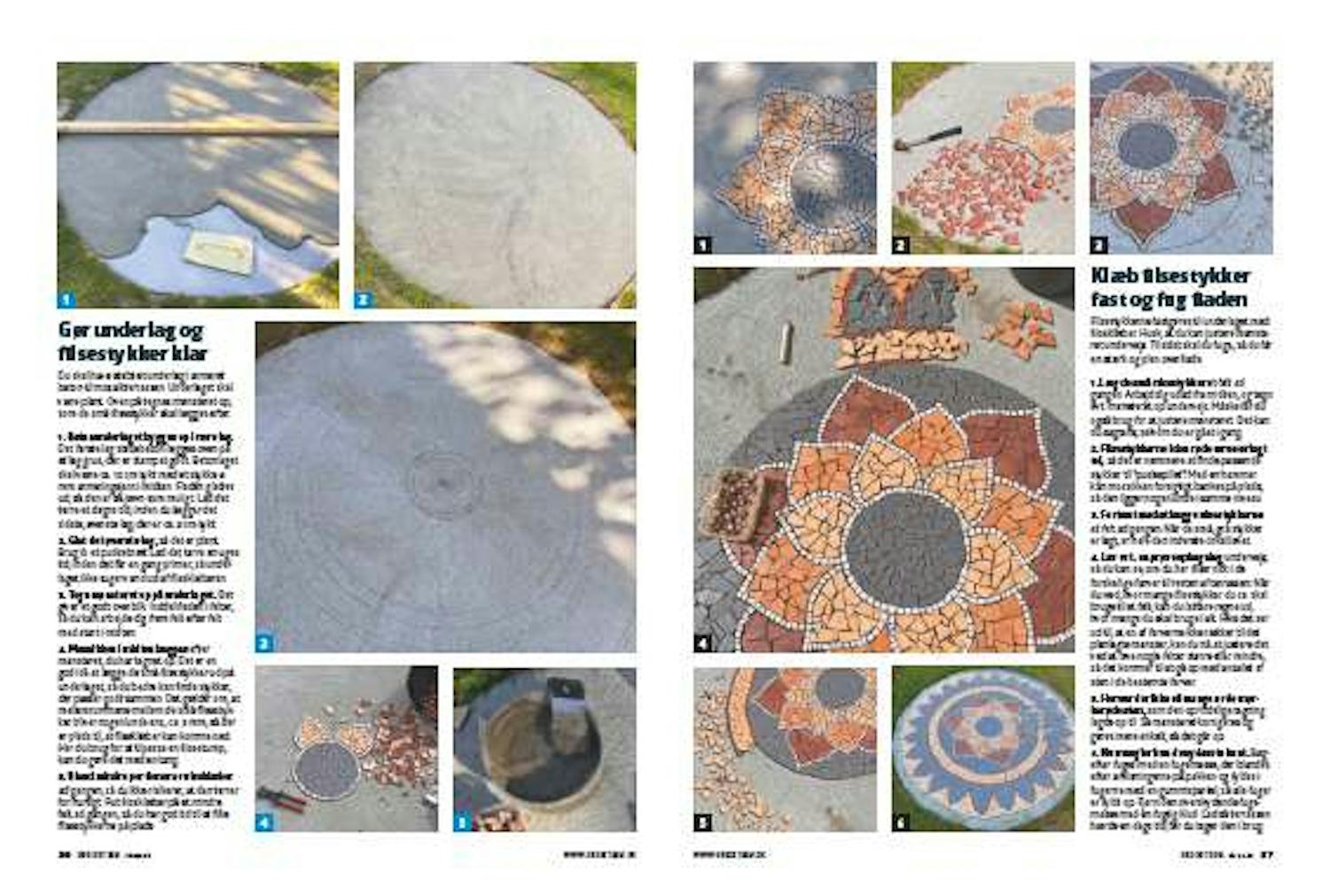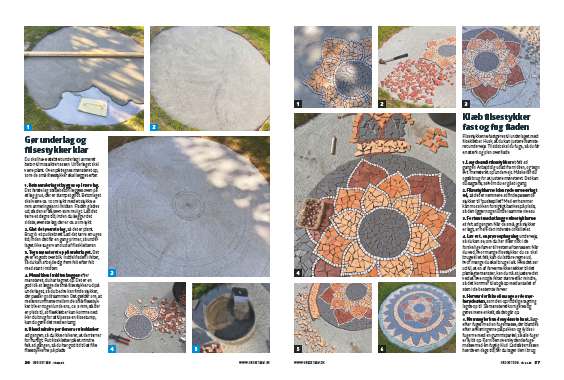 Flisestykkerne fastgøres til underlaget med fliseklæber. Husk, at du kan justere mønsteret undervejs. Til sidst skal du fuge, så du får en stærk og plan overflade.