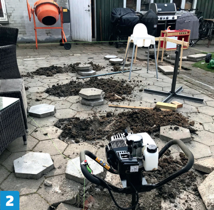 Placér støberør eller kloakrør som her i hullerne, så de rager et par cm op over jordhøjde og blandt dernæst cement og støbemix i forholdet 1:7.