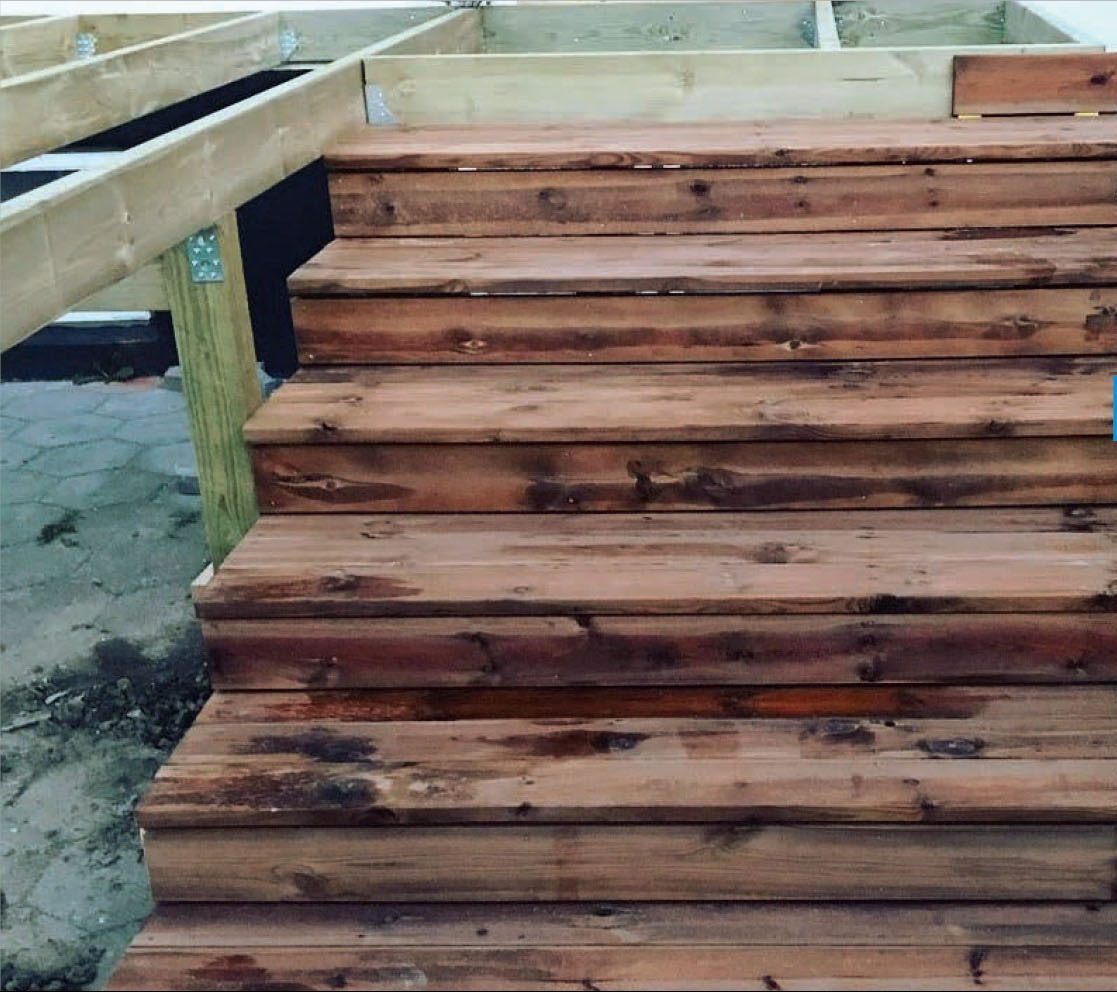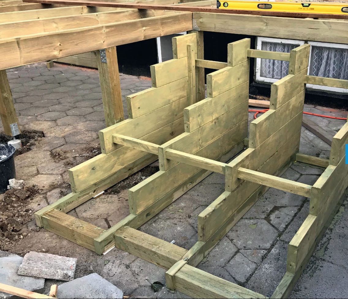 For at få den helt rigtige størrelse bygger vi selv vores trappe. Vi bruger spærtræ, som vi lader hvile på en tryk imprægneret reglar, der bedre kan klare vand og fugt.