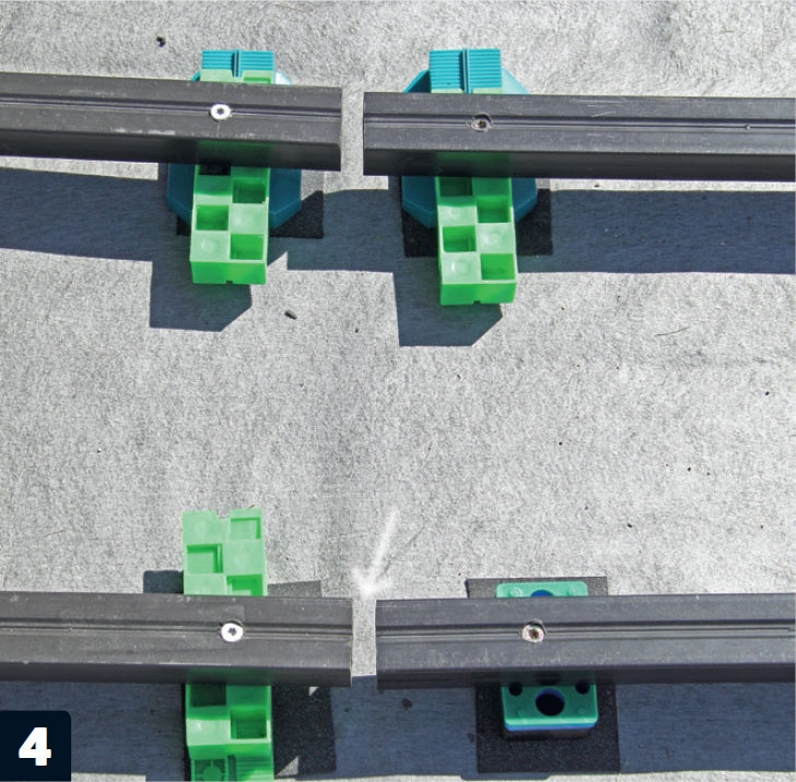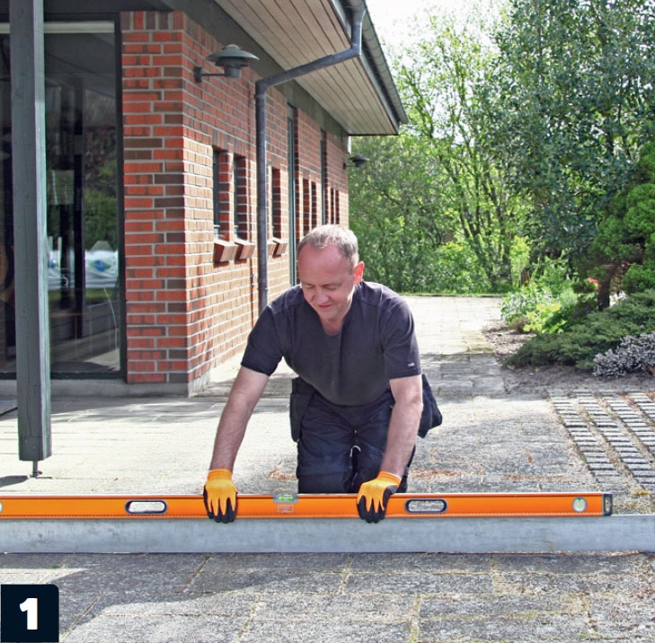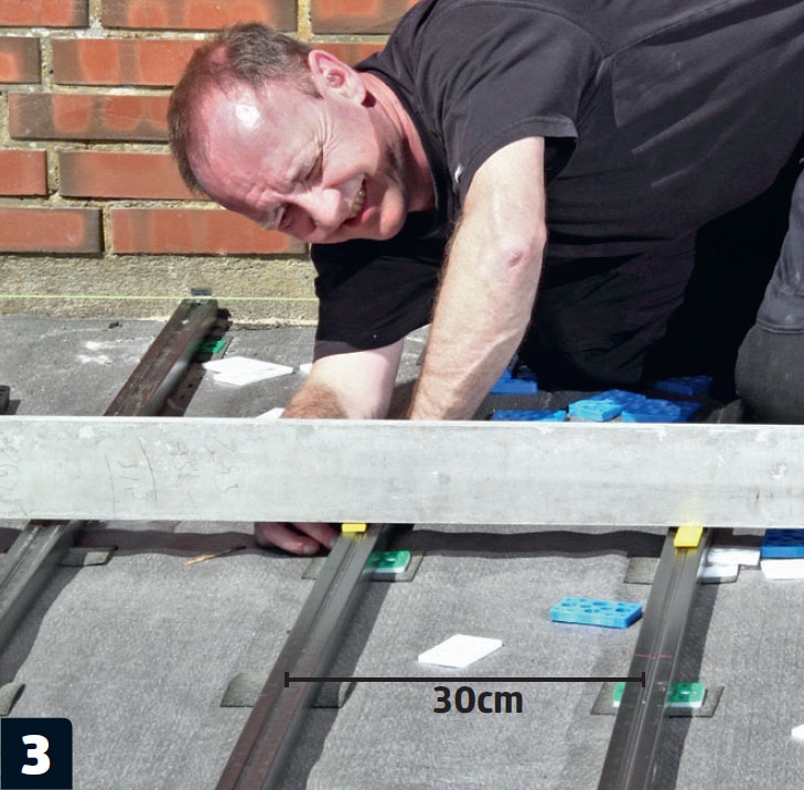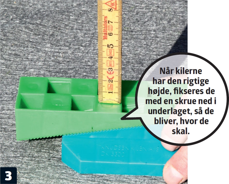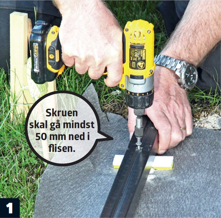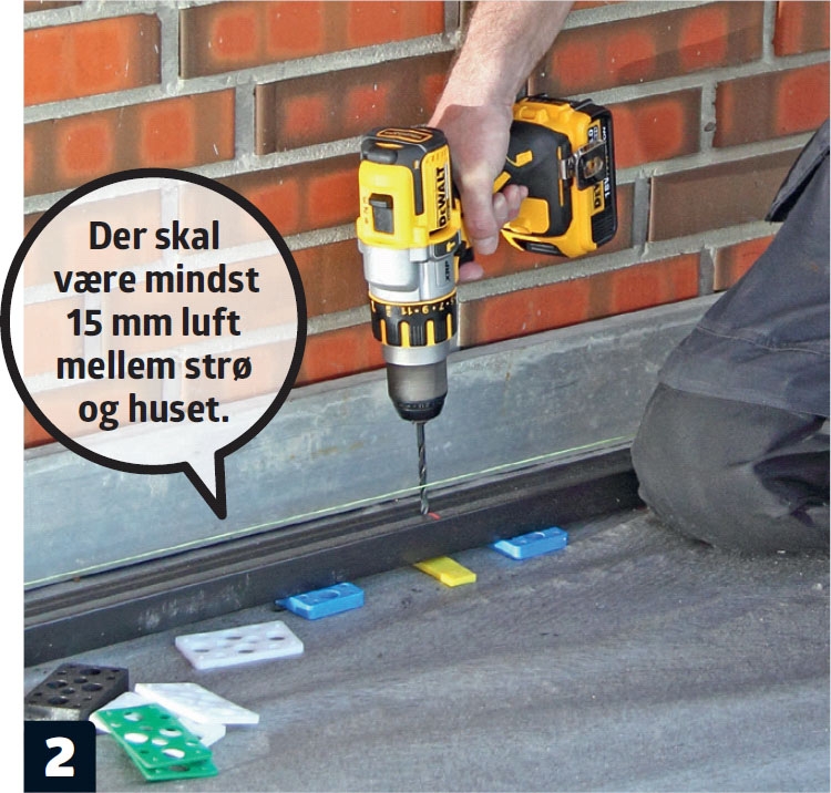 Den strø, der skal ligge langs huset, klodses op. Opklodsningerne i enderne og på midten skrues fast til fliserne. De andre stilles blot på murpap, som med tiden vil smelte fast på klodser og underlag.