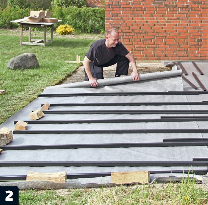 Vi ruller fiberdug ud under den nye terrasse for at undgå, at der gror ukrudt op mellem brædderne. Vores opklodsninger vil senere holde dugen på plads. Indtil da lægger vi strøer og sten på fiberdugen.