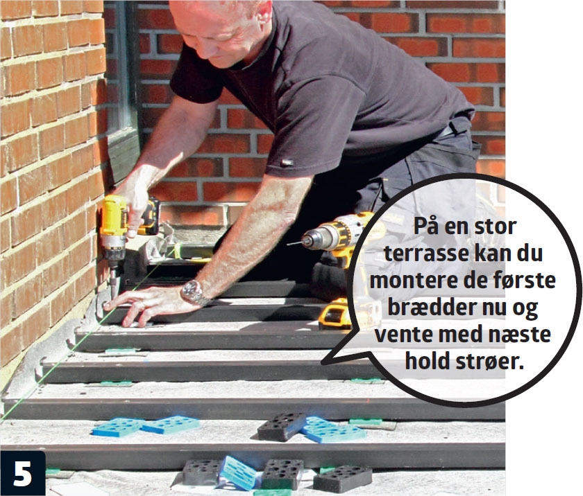 Resten af strøerne fordeles på arealet. Når strøerne i begge sider er på plads, er det nemt at klodse de øvrige op. De fleste opklodsninger skrues fast, så de ikke vælter, inden vi får lagt brædderne på dem.