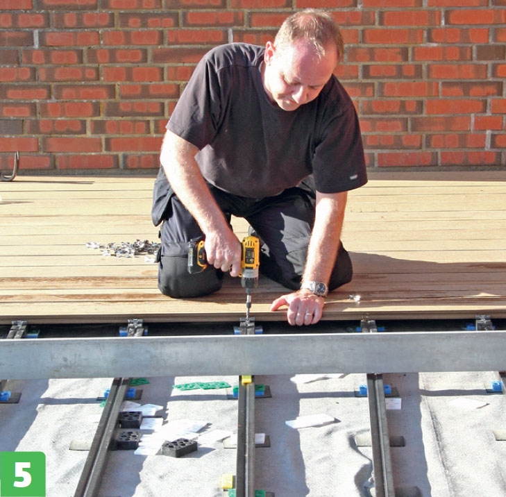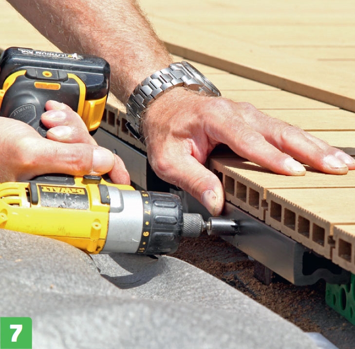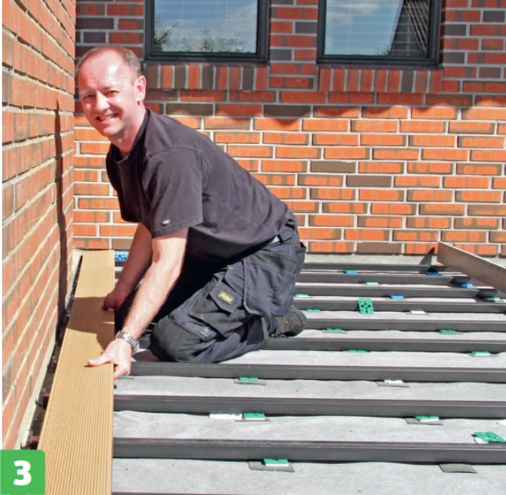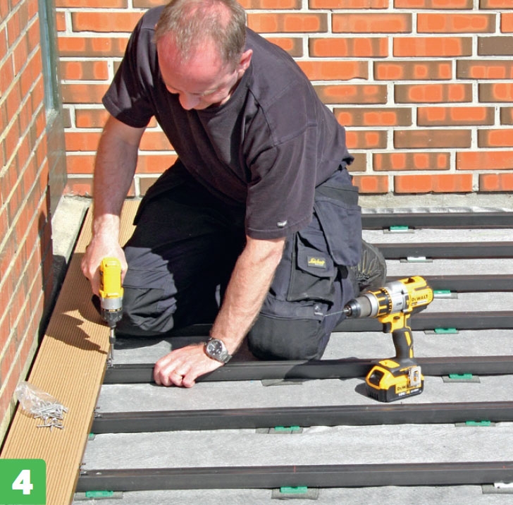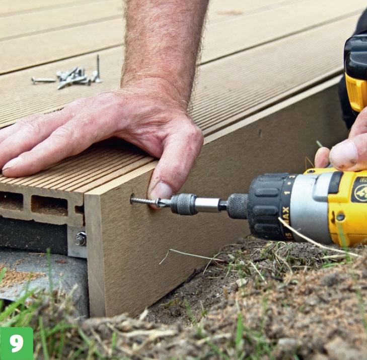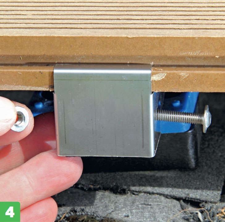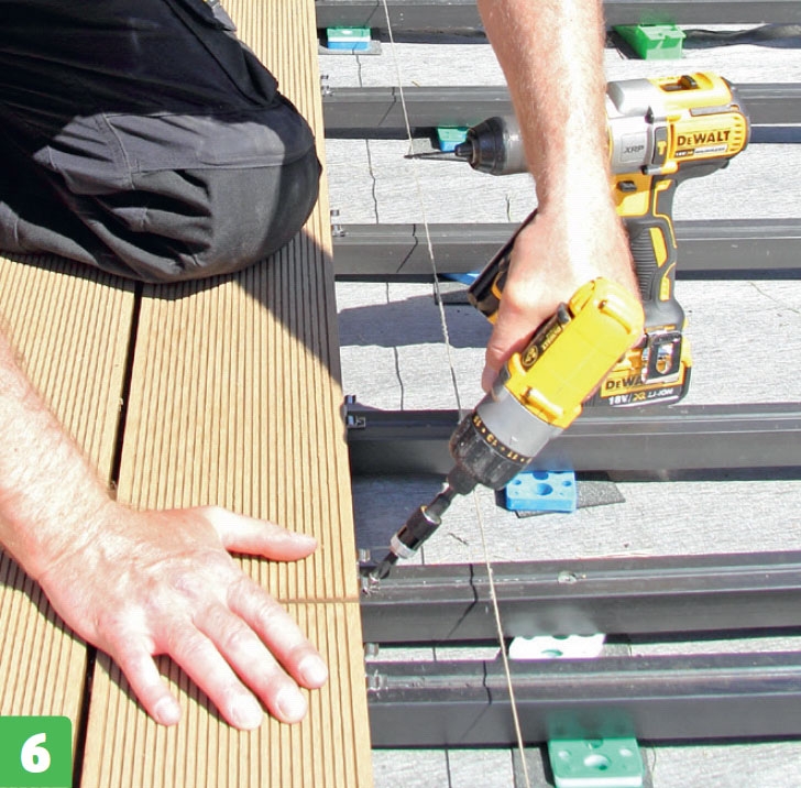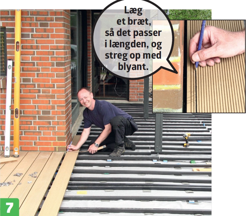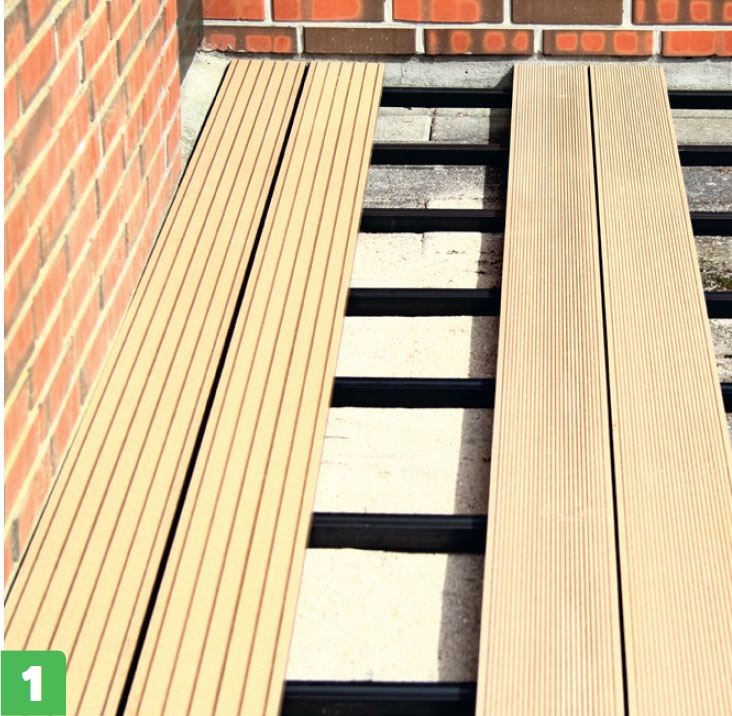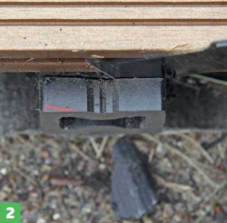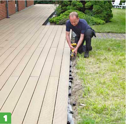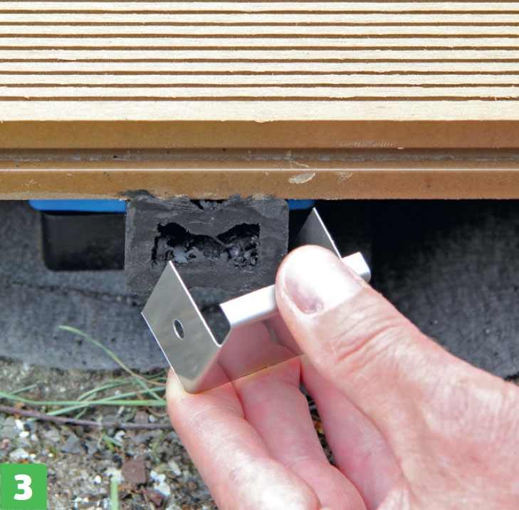 Kompositbrædder fås massive, men dem, vi bruger her, er hule og har en not i begge sider. Derfor kan de skrues fast med beslag, så skruerne er skjult under terrassebrædderne.