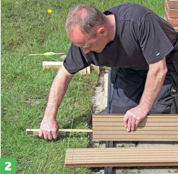 Kompositbrædder skal samles forskudt. To brædder ved siden af hinanden må ikke samles på samme strø. Mønstret bestemmer du selv, men du kan starte med at montere et helt bræt. I næste række starter du med et halvt bræt. I den tredje række igen et helt osv. Det giver et roligt mønster og vil give det laveste forbrug af strøer, fordi alle samlinger i bræddernes længderetning vil kræve to rækker strøer.