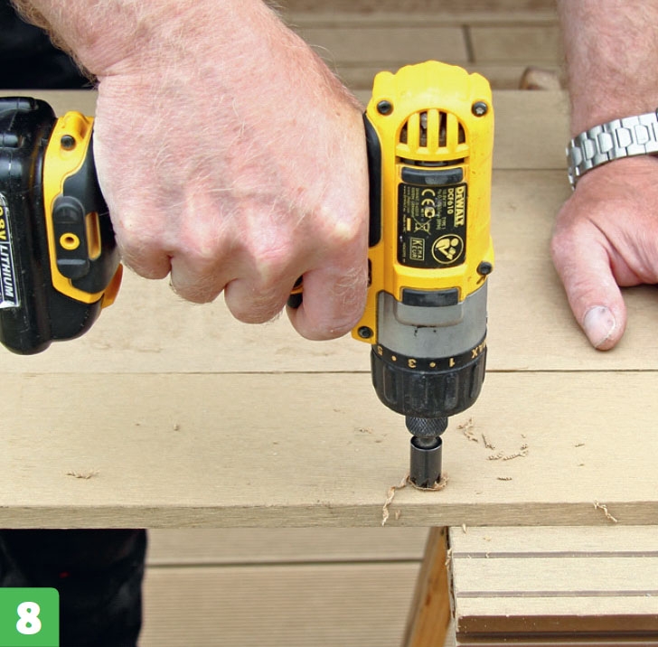 Kantlisterne gøres klar. Der skal bores for til alle skruerne, og vi undersænker skruehullerne, så skruerne bliver mindre synlige. Er kantlisterne for høje, kan de saves til i den side, der skal vende nedad.