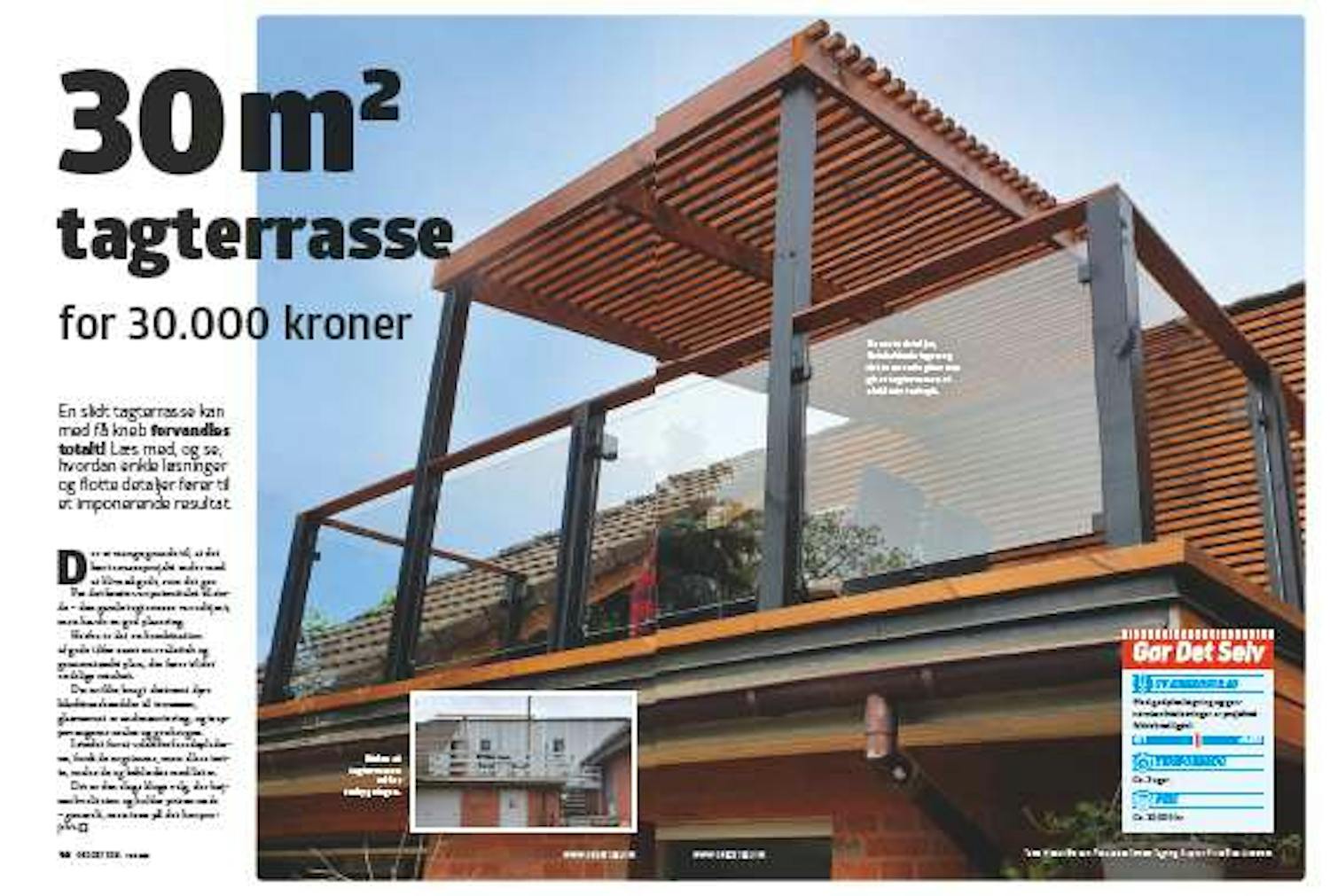 Et solidt værn er et must på en tagterrasse. Værnet kan fx bestå af hærdet glas (D), som i øvrigt kan købes i mange forskellige farvetoner. Glassene bestilles efter mål, men bestil dem først, når stolperne er sat!